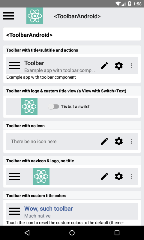 ToolbarAndroid是一个包装了仅限Android平台的工具栏(Toolbar)部件的React组件。一个Toolbar可以显示一个徽标,一个导航图标(譬如汉堡形状的菜单按钮),一个标题与副标题,以及一个功能列表。标题和副标题会在中间显示,徽标和导航图标会在左侧显示,而功能列表则在右侧显示。